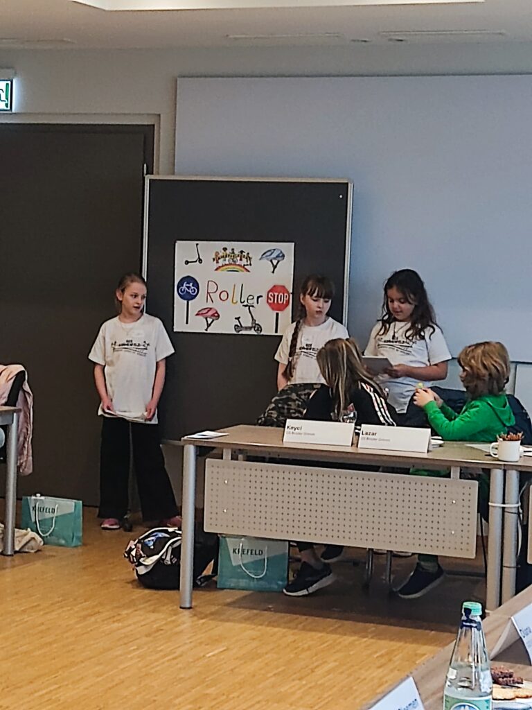 Drei tolle Schülerinnen aus der 3. und 4. Klassenstufe vertraten die GGS Krähenfeld. Sie stellten unser Rollerprojekt mit Hilfe eines Plakates vor. Da viele SchülerInnen noch kein eigenes Fahrrad besitzen, sollen Roller angeschafft werden. Nur so ist eine gute Vorbereitung auf das Fahrradtraining möglich.