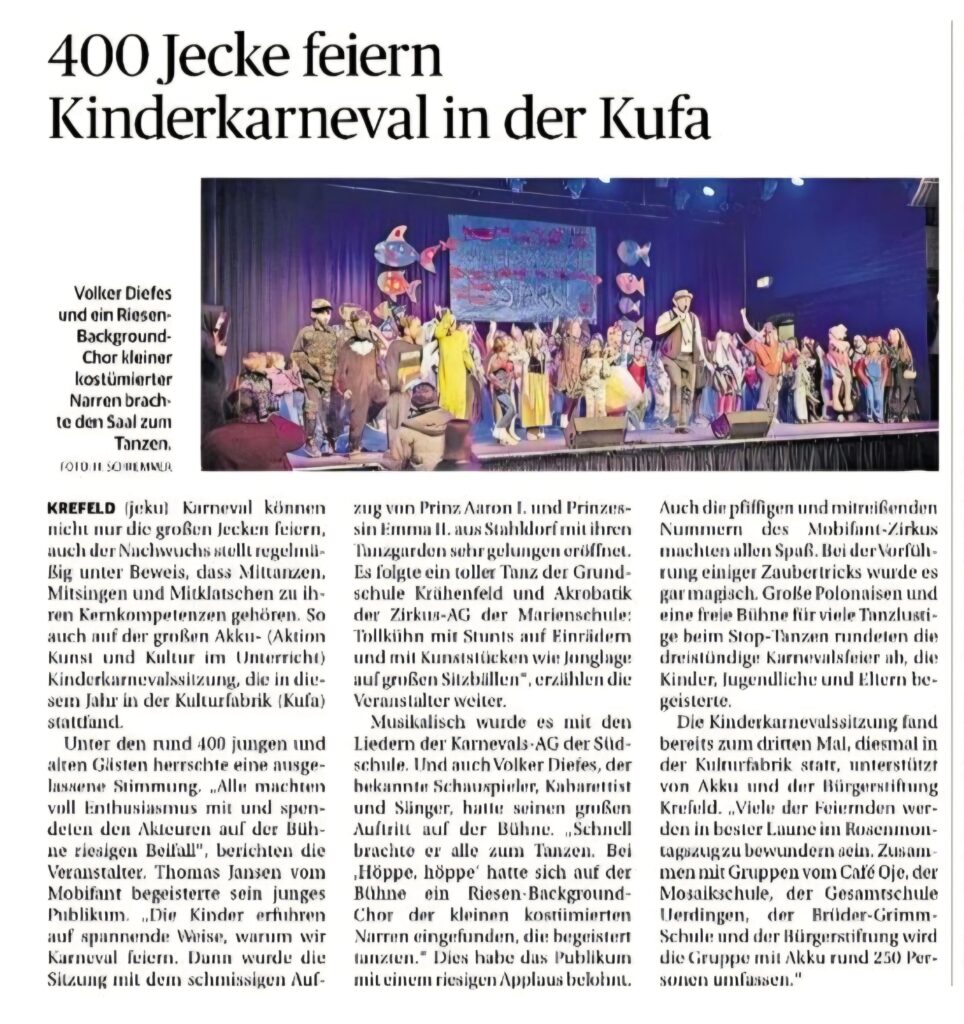Die Kostüme konnten dann zum ersten Mal am 11.02.2026 zum Kinderkarneval in der Kufa präsentiert werden. Hier führte unsere SchülerInnen auch einen einstudierten Tanz auf. Mehr können sie folgendem Artikel entnehmen: